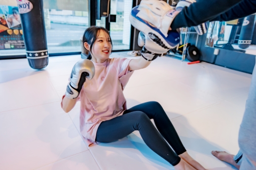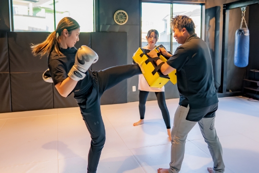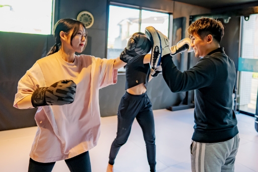 トレーナーのミットに打ち込み、フォームの微調整とコンビネーションの完成度を高めます。テンポや距離感を意識することで、試合さながらの圧力・スピード・対応力が身につきます。強弱や角度の変化、蹴りの切り替えなども織り交ぜて、短時間で濃い練習ができます。