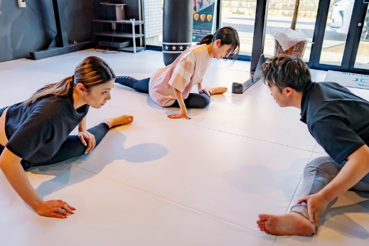 ウォーミングアップとして、縄跳びや軽いエクササイズで全身をリズミカルに動かし、心拍数を段階的に上げていきます。足さばき・タイミング・持久力を同時に鍛えながら、下半身の柔軟性も高められる内容です。肩まわりや股関節の可動域も意識して動かすことで、ケガの予防につながります。呼吸の安定や、呼吸のコントロールを整えていきます。